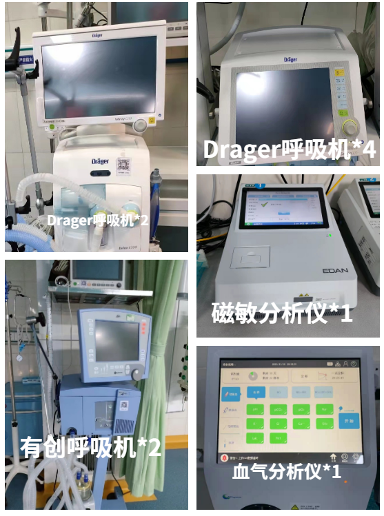 目前科室对外开放床位10张,内设隔离病房1间,拥有完善的吊塔及中心监护系统、先进的微量注射泵输注管理系统、德尔格有创呼吸机6台、谊安牌有创呼吸机4台、科曼呼吸机3台,飞利浦无创呼吸机2台、高流量氧疗机3台、转运呼吸机2台,还配备有除颤仪、PICCO血流动力学监测设备、肺动脉漂浮导管及监测设备,以及LiDCO无创血流动力学监测设备、床旁血气分析仪、POCT分析仪、百特牌血液净化机、可视喉镜平台及电子纤维支气管镜、床旁超声机、临时起搏器、亚低温治疗仪等先进设备。